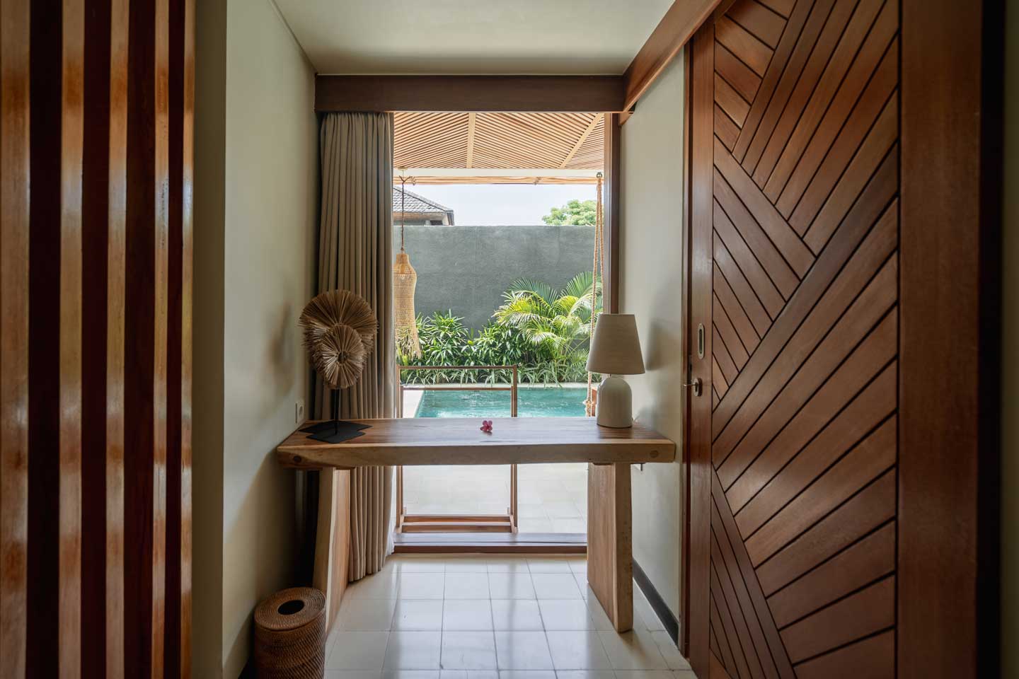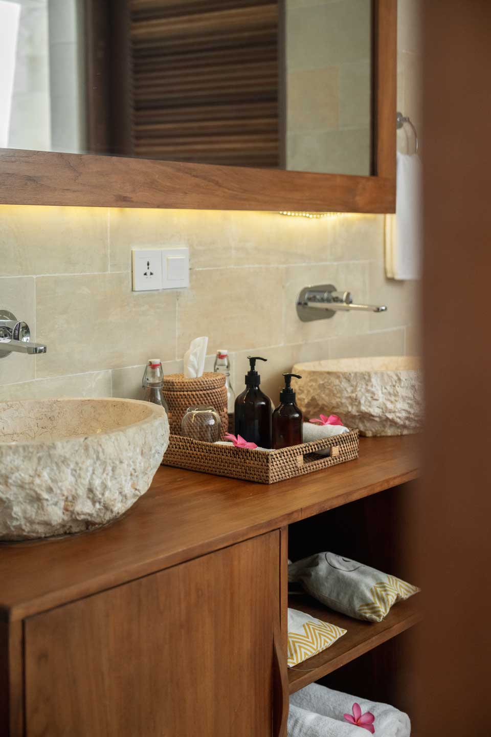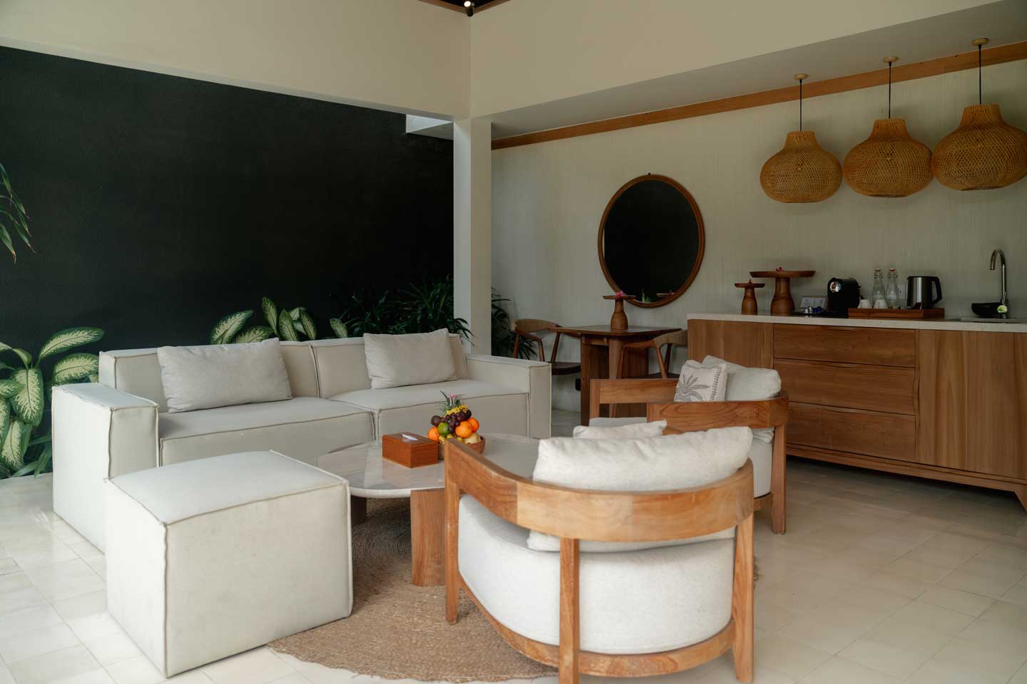 Designed with an authentic open-air living space, the villa features a spacious en-suite bedroom with a double bed, desk, and elegant dresser. The bathroom boasts a double vanity, enhanced with natural wood and lush tropical flora.