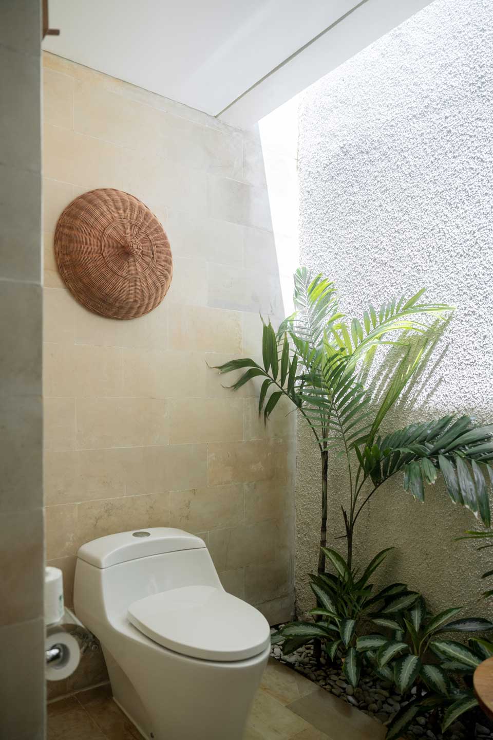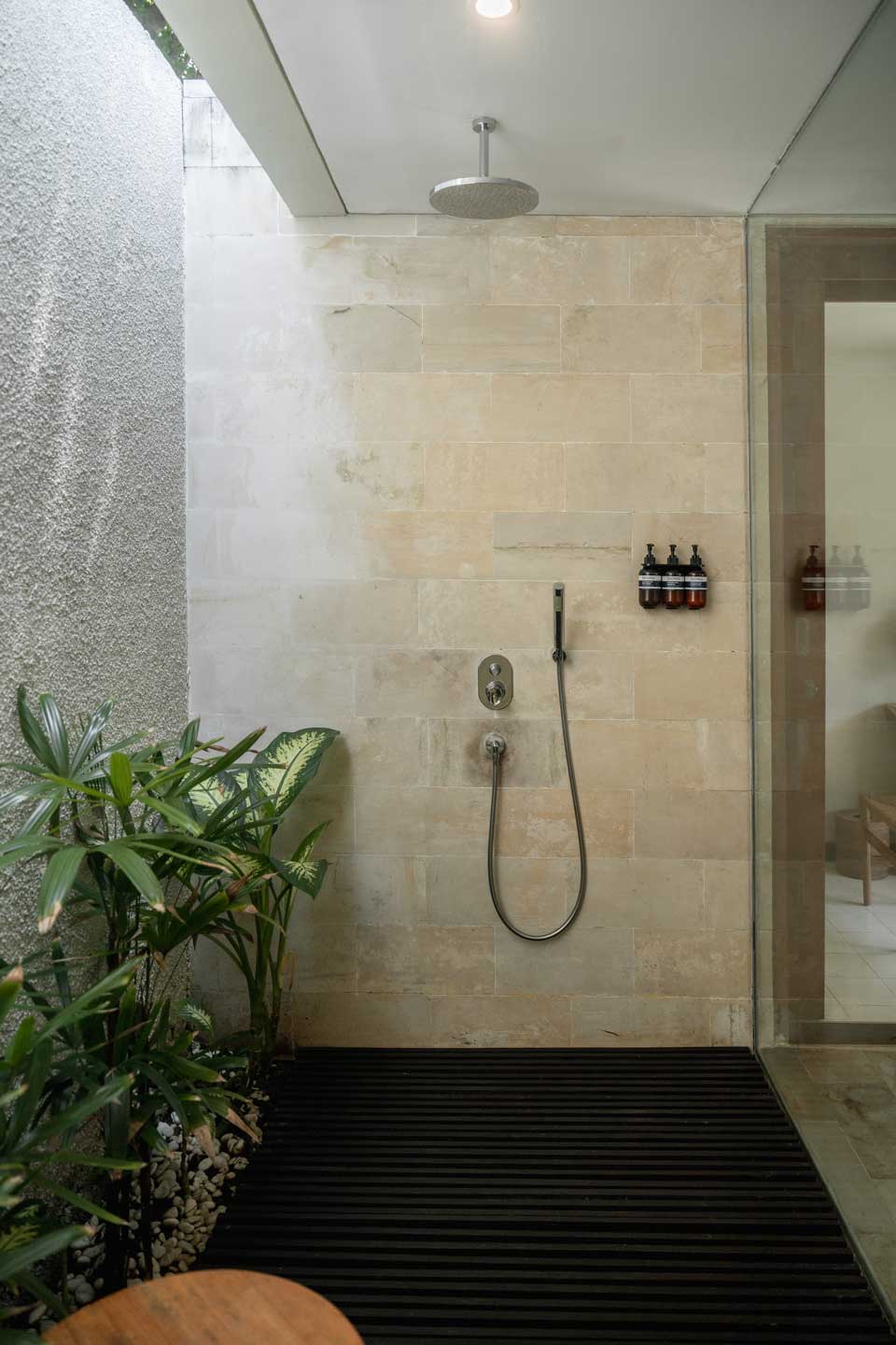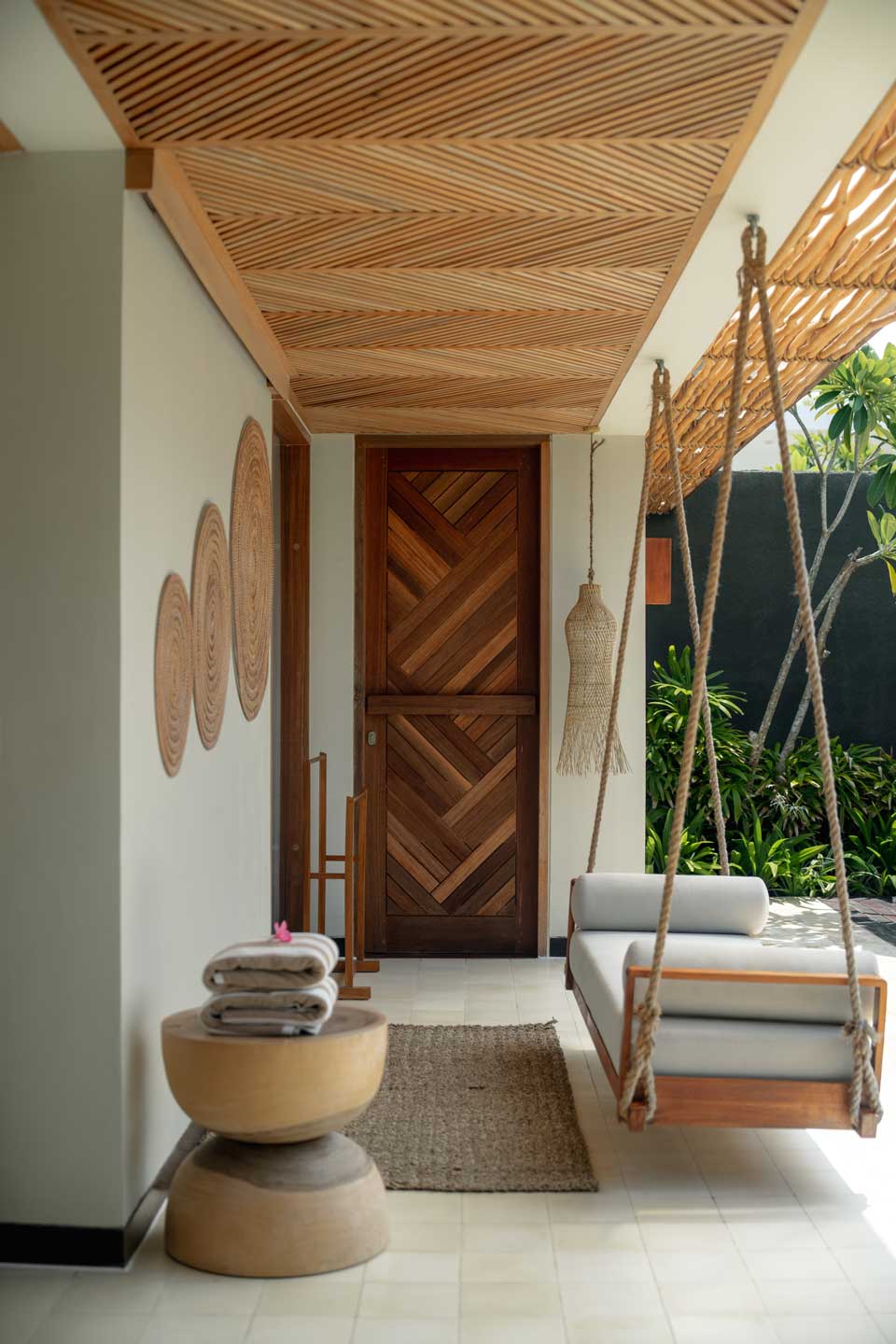 Designed with an authentic open-air living space, the villa features a spacious en-suite bedroom with a double bed, desk, and elegant dresser. The bathroom boasts a double vanity, enhanced with natural wood and lush tropical flora.